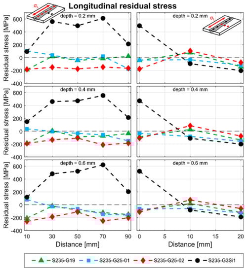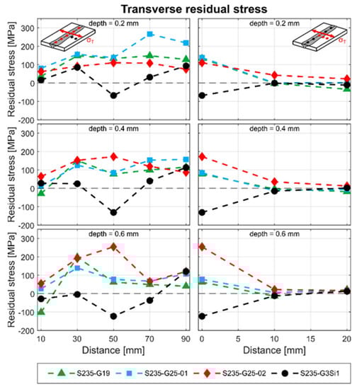 First, the longitudinal residual stresses were analyzed (Figure 10, left). The similar weld shows high tensile stresses along the weld seam at all measuring depths of 0.2, 0.4 and 0.6 mm. In contrast, a significant reduction in stresses can be observed in the dissimilar welds. Residual stresses around 0 MPa are already detectable in specimen G19. This stress level does not change even in the measuring depths up to 0.6 mm. The highest compressive stresses are generated in specimen G25-02. Here, compressive stresses around −200 MPa can be observed at all measured depth.