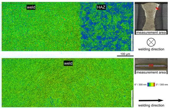 Besides the phase content of the weld, the EBSD measurements generally could also indicate the occurrence of preferred crystal orientations within the weld. In Figure 14, therefore, inverse pole figure (IPF) maps are plotted, showing the crystal direction locally aligned with the welding direction. Since during the martensitic transformations only martensite plates with a limited number of orientations can form, clusters of the same sets of colors indicate the extension of the austenite grains present before the martensitic transformation. As can be seen, these prior austenite grains extend over several 100 µm, which makes it difficult to reliably detect preferred orientations in the complete weld. In contrast to the high number of fine martensite plates, only a small number of prior austenite grains are covered by the measurement areas, the orientations of which will determine the martensite orientations present. In conclusion, locally preferred orientations exist determined by the orientation of the prior austenite grain. Therefore, if globally preferred orientations exist over larger areas of the weld, this cannot be decided by EBSD.