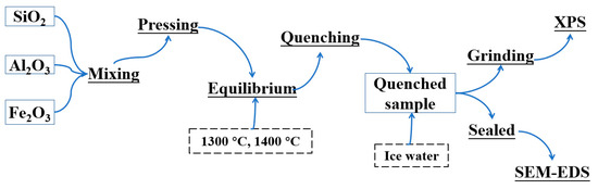 The high viscosities and sluggishness of the crystallization result in the liquid phase being retained as glass during the quenching for silica-containing melts [34]; therefore, the reliable thermodynamic equilibrium-quenching technique [35] was employed to explore the equilibrium phase relations for an SiO2-Al2O3-Fe2O3 system, and the experimental process could be explained by the flow chart in Figure 1.