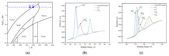Furthermore, XPS analysis was employed to evaluate the prediction by FactSage 8.1, and to reveal the influence of other elements, i.e., Si and Al, on the oxidation state of the Fe. The XPS spectra for sample B6 at 1300 °C and 1400 °C are shown in Figure 2b and Figure 2c, respectively. As can be seen, the Fe element was stable as trivalent Fe3+ at 1300, while at 1400 °C, both bivalent Fe2+ and trivalent Fe3+ were found in sample B6. Moreover, the mol ratio of Fe2+/Fe3+ was estimated as 0.87:1 from the relative areas of the Gaussian peaks under Fe2+ and Fe3+ [41], which was higher than the stoichiometric mol ratio of the magnetite (Fe3O4) phase, indicating that the magnetite presented as solid solution properties, while for the consideration of convenient presentation, the stoichiometric composition of Fe3O4 was employed in the present study. The XPS analysis verified the prediction by FactSage; therefore, the oxidation states of Fe2O3 at 1300 °C and magnetite (Fe3O4) at 1400 °C were adopted for the discussion, as well as for the construction of the phase diagram in the following sections.