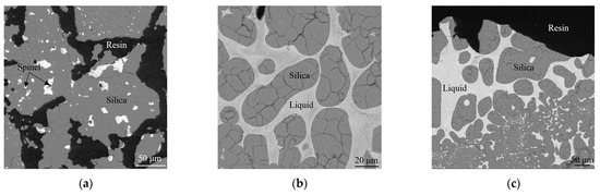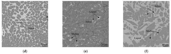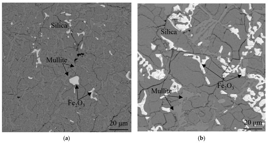 The SEM micrographs and compositions for the equilibrium phases at 1300 °C are shown in Figure 5 and Table 2, respectively. The equilibrium results at 1300 °C for samples B5 and B6 are relatively straightforward compared with the results at 1400 °C. As illustrated by Figure 5a,b, both samples B5 and B6 presented as a silica-mullite-Fe2O3 three-solid-phase equilibrium, indicating that 1300 °C is below the ternary eutectic temperature. Similarly, it can be estimated that the primary phase fields of silica, mullite, and Fe2O3 are adjacent to each other, from the perspective of thermodynamic equilibrium theory [43].