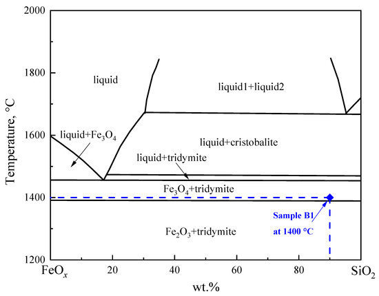 Sample B1 was Al2O3 free, and was composed of 90 wt.% SiO2 and 10 wt.% Fe2O3; no liquid phase was presented at 1400 °C, and the equilibrium phase was silica and magnetite, as shown by Figure 3a. The equilibrium result of sample B1 was consistent with the SiO2-FeOx binary phase diagram in air [42], as indicated in Figure 4; Fe2O3 will be transformed to Fe3O4 when temperature is above 1390 °C, showing SiO2-Fe3O4 coexisting at 1400 °C. Meanwhile, for samples B2, B3 and B4, the liquid-silica two-phase equilibrium was verified (Figure 3b–d), indicating that the addition of 5 wt.% and 10 wt.% Al2O3 have a trend of decreasing the melting temperature compared with the composition of sample B1. Furthermore, the three-phase equilibrium of liquid-silica-mullite was confirmed for samples B5 and B6, as presented by Figure 3e,f. From the thermodynamic law of the phase-adjacent rule [43], it can be concluded that the primary phase fields of silica and mullite are adjacent to each other.
