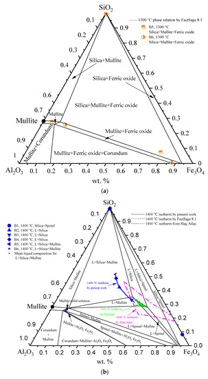 Based on the experimental results described above, the 1300 °C and 1400 °C isothermal phase diagrams were constructed and projected onto a SiO2-Al2O3-Fe3O4 phase diagram in Figure 6a and Figure 6b, respectively. In Figure 6a, the compositions for the equilibrium solid phases at 1300 °C (orange symbols) are projected; as can be seen, the compositions of the equilibrium silica phases are consistent with the stoichiometric composition, while both the equilibrium mullite and ferric oxide phases appeared to be solid solution phases. The composition of the mullite solid solution shifts to a somehow higher Fe2O3 content direction, while the composition of the ferric oxide shifts to higher Al2O3 and SiO2 concentrations.