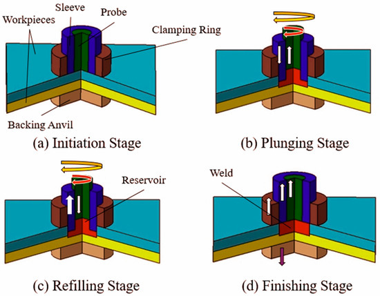 Stages in the refill friction stir spot welding (refill FSSW) process: (a) stage 1—initiation by clamping the workpieces firmly; (b) stage 2—shoulder-plunging stage; (c) stage 3—refilling of material back into workpiece; (d) stage 4—finishing stage.