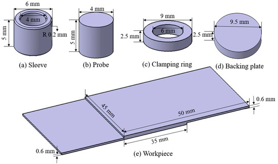 The geometries used in the numerical model of refill FSSW consist of a toolset, workpiece, and a backing anvil. The detailed dimensions of geometries are shown in Figure 2. The geometries were modelled in CATIA (V5R20, Dassault Systèmes, Vélizy-Villacoublay, France) and thereafter imported and assembled in DEFORM-3D (version 10.2, Scientific Forming Technologies Corporation, Columbus, OH, USA). To increase the contact area and reduce the stress due to the sharp edge during the plunging stage, a fillet was added at the bottom edges of the shoulder [19,25]. The sheets in the experiment are clamped tightly between the backing anvil and clamping ring. Therefore, two sheets in the numerical model are assumed as a single sheet. To reduce the computational time, the length of the workpiece and the heights of the toolset are reduced.