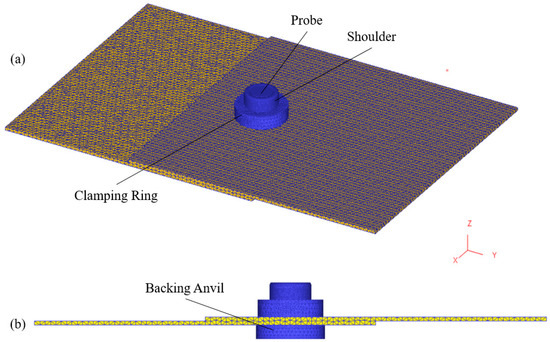 Meshed model of the refill FSSW process setup. (a) Isometric view; (b) side view.