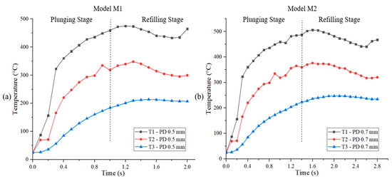 The numerical temperature results from the models M1, M2, and M3 at the locations T1 (weld center), T2 (4 mm away from the tool central axis), and T3 (7.5 mm away from the tool central axis) are plotted, see Figure 4. The numerical model is verified by comparing the temperature results of model M2 with experimental temperature results measured at the locations T1, T2, and T3 from the previous study [15]. The numerical model M2 is the replication of the previous experimental study conducted with the same process parameters (PD 0.7 mm, RS 3000 rpm, and PR 0.5 mm/s), material, and toolset. Good correspondence between numerical temperature results and experimental temperature results is observed at all three locations. The peak values of the temperatures measured in the experimental study are T1–495 °C, T2–386 °C, and T3–233 °C, and the peak temperatures obtained for model M2 from the simulation are T1–506 °C, T2–377 °C, and T3–246 °C. For model M1 and model M3, the peak temperatures at the location T1 are 475 °C and 540 °C, respectively. The peak temperatures in all three models are observed after the plunging stage and at the beginning of the refilling stage, at roughly 60% of the process time. The lower temperatures reported in model M1 when compared to model M2 are due to reduced PD and welding time. Likewise, the higher temperatures in model M3 are due to increased PD and welding time. In all the plots of the three models, at T1, there is a steep temperature rise initially, and then a gradual increase and thereafter a gradual drop towards the process end is observed. It is seen that the temperatures drop with an increase in distance from the tool central axis in all three models. The temperature curve behaviors at location T2 for the three models have identical behaviors to the temperature curve at location T1. At location T3, a gradual increase in temperatures and a flatter trajectory towards the end of the process are seen in all three models. The peak temperature values from the numerical models M1, M2, and M3 at the locations T1, T2, and T3 are summarized in Table 2.