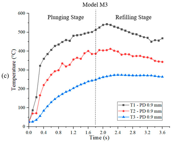 The temperatures during the refill FSSW process have a direct impact on softening and stirring of the material. The temperature contours of the models M1, M2, and M3 are presented in Figure 5. For all the models, the temperature distribution is symmetrical about the tool central axis, and temperatures dropped with an increase in distance from the tool central axis. The maximum temperatures are observed within the outer periphery of the shoulder, the region where material stirring takes place, i.e., the stir zone (SZ). The maximum temperatures for the models M1, M2, and M3 are 490 °C, 520 °C, and 560 °C, respectively. These temperatures, when compared to the melting temperature of the material (635 °C), are 0.77 Tm, 0.81 Tm, and 0.88 Tm, respectively. The temperatures increased with the increase in PD, which can be attributed to longer welding times and an increase in the shearing of the material. In the SZ, the temperatures are in the range of 440 °C to 490 °C for the model M1, between 460 °C and 520 °C for the model M2, and between 490 °C and 560 °C for the model M3. It can be seen that the temperatures in the SZ crossed the solidus temperature, which is 475 °C [31], especially for the models M2 and M3. The (MgZn2), which are hardening precipitates present in the AA7075-T6 alloy, are rapidly dissolved in the SZ in this high-temperature range (475 °C to 560 °C) [32]. This will soften the material in the SZ and enhance the movement and shearing of the material.