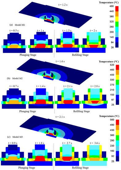 Temperature distribution during refill FSSW process. (a) model M1; (b) model M2; (c) model M3.