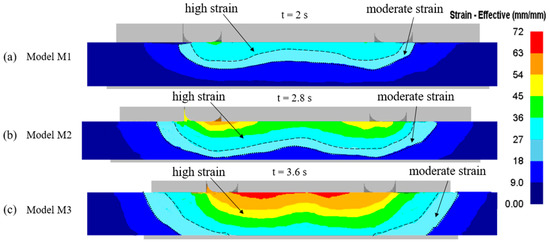 The microstructure and grain size of the weld is determined by the strain, strain rate, and temperatures. The effective strain at the end of the refill FSSW process is shown in Figure 6. The effective strain contour in all three models is symmetrical about the tool’s central axis. It can be seen that with the increase in the PD, the effective strain is also increased. High strains (27–72 mm/mm) were observed within the SZ, and adjacent to it, there is a moderate strain zone (18–27 mm/mm). The strain contours from the simulation can be correlated to the microstructures obtained from the experimental results from the earlier study [15]. The shape of the high strain region zone is matching with the fine grain microstructure region in the SZ from the experiments. The fine grain microstructure is a result of dynamic recrystallization, which happens due to severe plastic deformations and temperatures in the SZ. The SZ from the simulation results can be distinguished by high plastic strain and high temperatures. The region of fine grains along the thickness of the weld cross-section increases with the increase in the PD, which can be observed from the microstructure in the experimental results presented by Yamin et al. [15]. Furthermore, from the simulation results, it can be seen that the width and thickness of the high strain region increase with the increase in the PD. Adjacent to the SZ, there is a thermo-mechanically affected zone (TMAZ), which experiences moderate temperatures and moderate plastic strains. The moderate plastic strain regions in all the models and high strain regions in model M3 are inconsistent with the microstructure results outside the shoulder periphery as these regions are wider. As identified from the microstructure results from the experimental results, TMAZ is a very narrow zone outside the shoulder periphery, and the moderate strain contour is wider in the simulation results. The material movement outside the shoulder periphery should be taken into consideration to identify the TMAZ, which is discussed in the following sections. The region which is affected only by the thermal cycles without mechanical movement of the material is the heat-affected zone (HAZ).
