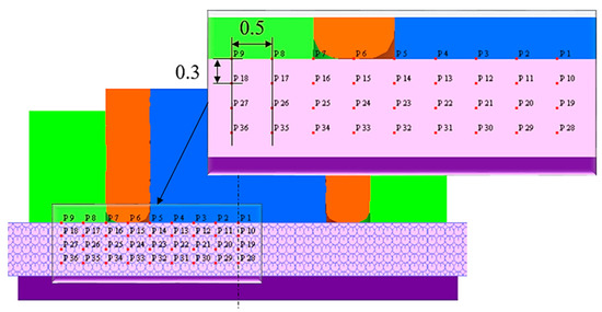 Material flow is one of the important factors in deciding the joint quality of the refill FSSW process [20,33]. Here, to analyze the material flow in the three models, the behavior of the material flow is tracked using the flownet option and point tracking marked across the cross-section, see Figure 7. The flownet is marked with fine circles (6) along the thickness of the workpiece. The initial positions of the points were located on one half of the cross-section due to the symmetric nature of the process. The points are located along the thickness with a vertical distance of 0.3 mm between them and horizontally separated by a distance of 0.5 mm. The location points P1–P9 represent the top of the sheet, points P10-P18 represent the middle of the top sheet, the points P19–P27 represent the interface between top and bottom sheets (note that the workpiece is modelled as a single sheet combining top and bottom sheets), and the points P28-P36 represent the middle of the bottom sheets.