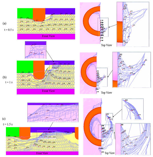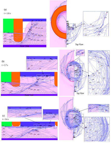Material flownet and point positions represent material flow in model M3 during the refill FSSW process. (a) Front View and Top View–1.8 s; (b) Front View and Top View–2.7 s; (c) Front View and Top View–3.6 s.