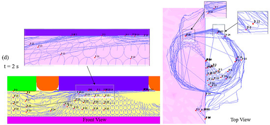 Material flownet and point positions representing material flow in model M1 during the refill FSSW process. (a) Front View and Top View-0.5 s; (b) Front View and Top View-1 s; (c) Front View and Top View-1.5 s; (d) Front View and Top View-2 s.