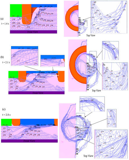 Material flownet and point positions represent material flow in the model M2 during the refill FSSW process. (a) Front View and Top View–1.4 s; (b) Front View and Top View–2.1 s; (c) Front View and Top View–2.8 s.