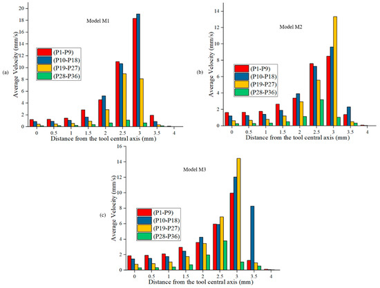 Average velocities for the points located in Figure 7, during refill FSSW. (a) model M1; (b) model M2; (c) model M3.