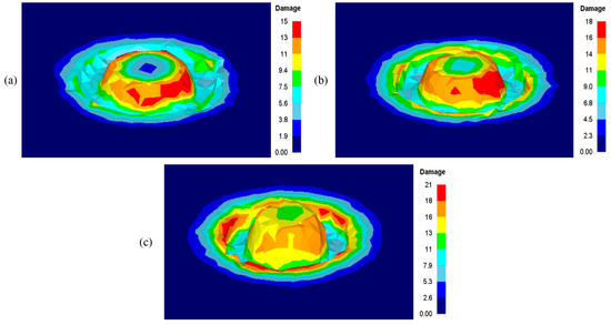 Damage factors at the end of the plunging stage during refill FSSW. (a) model M1; (b) model M2; (c) model M3.
