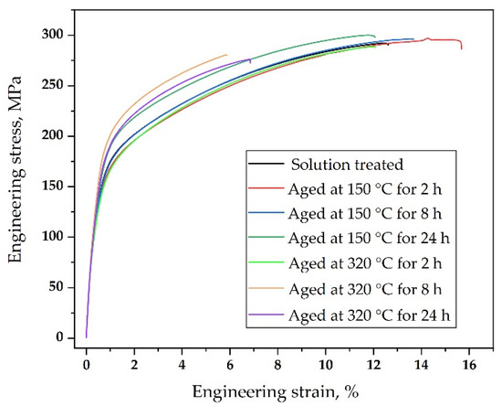 - Aging treatment leads to relatively higher hardness compared to that of the solution treated alloy. Aging at 150 °C for 24 h is optimal for an increase in both strength and plasticity.