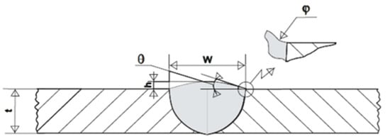 Welding parameters (electric welding current, arc voltage welding, and welding travel speed) were measured, and the heat input during welding was calculated according to the method described in EN 1011-1 []. The coefficient of thermal efficiency was measured according to the EN 1011-1 standard for the MAG welding process and the value of 0.8 was adopted. The calculation was performed using the following formula: