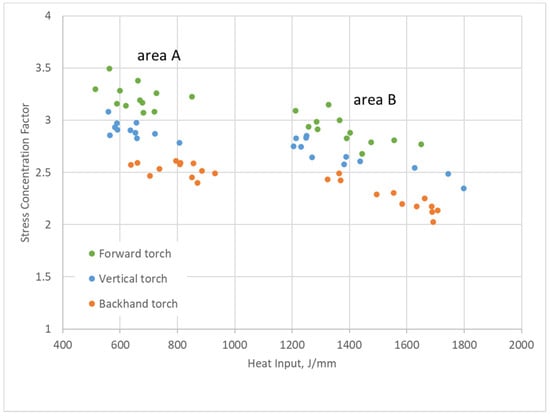 The results were classified into two groups and are shown in Figure 3. The higher heat input was marked in the Figure 3 as area A, while the lower heat was area B. The former resulted in a lower stress concentration factor, increasing the welded joint temperature. The temperature, in turn, increases the time needed for the molten material to solidify and form a good welded joint surface shape. This reduces the stress concentration and the number of cracks occurring during the weld operation.