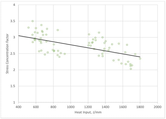 The stress concentration factor was used as a proxy for analyzing fatigue crack risk. The heat input to the welded joint was calculated according to the recommendations of the European Committee for Standards []. The data suggested that heat input is inversely proportional to the stress concentration factor (hence, fatigue crack formation). Therefore, factors affecting heat input should be controlled to minimize the chance of fatigue cracks occurring on welded joints. Such factors include welding current, welding voltage, and welding speed.