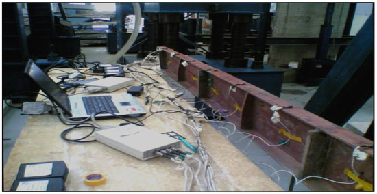 Uniaxial piezoelectric accelerometers, type BK 4507 B004, were used in this study. The accelerometers have a resonant frequency of more than 18 kHz, and frequencies range from 0.2 ×10−3 to 6 kHz. This type of accelerometer was chosen because it is lightweight, which reduces the effect of its weight on the modal properties of the tested model. Moreover, it has a high resolution, which is necessary for low-amplitude measurements. A multi-channel digital data acquisition system was used to collect data from accelerometers simultaneously, as shown in Figure 2. All steel beam specimens were tested in Civil Engineering Department Lab, King Saud University, Riyadh, KSA.