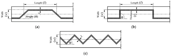 The numerical FE simulation was carried out on 23 steel beams with variable geometrical web thicknesses and different corrugated shapes and sizes, as shown in Figure 3. Two of these steel beams with a flat web will be used as control specimens. The control specimens are required for verification by comparing them with the experimental results and validating the accuracy of the numerical analysis in the modeling. They were also used to explore the effect of changing the shape of the steel web from flat to corrugated on both natural frequencies and displacement mode shapes. The 21 steel beams were divided into three groups based on the corrugated steel web shape. Three different corrugated steel web shapes (trapezoidal, rectangular, and triangular) and three thickness measurements with three corrugated web widths and lengths and three corrugated web angles were noted, as illustrated in Table 1. The weld seam between the web and the flanges was considered a perfect bond connection.