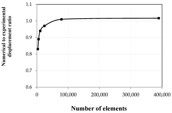 This study aims to determine the most appropriate FE meshing for analysis while minimizing the number of elements with acceptable accuracy. This could be obtained by changing the mesh density and then observing its effect on the displacement at point 5. Consequently, trials for the analysis of steel beams with the flat web without stiffener were carried out for different mesh densities through varying the maximum length of the elements from 2.5 to 20 mm. Figure 4 shows the variation of the number of elements versus the numerical to experimental ratios for 1st flexure displacement mode shapes. Small changes in displacement ratios were recorded for the number of elements greater than 78,540. The last value will be adopted in the analysis of tested samples hereafter. Therefore, the FE model mesh was divided into elements having a maximum size of 5 × 5 × 5 mm (height × width × length).
