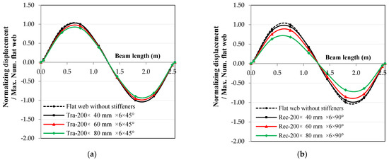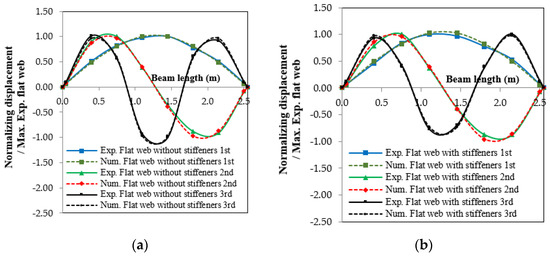 Curves showing the normalized displacements’ mode shapes gained from both experimental and FE simulations: (a) flat web without stiffeners and (b) flat web with stiffeners.