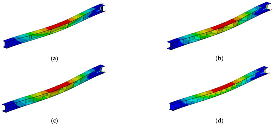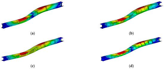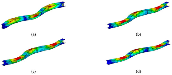Pattern of 1st flexure displacement mode shapes: (a) flat web with stiffener, (b) trapezoidal web, (c) rectangular web, and (d) triangular web.