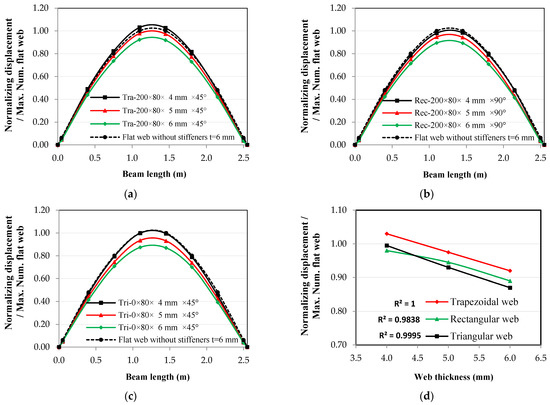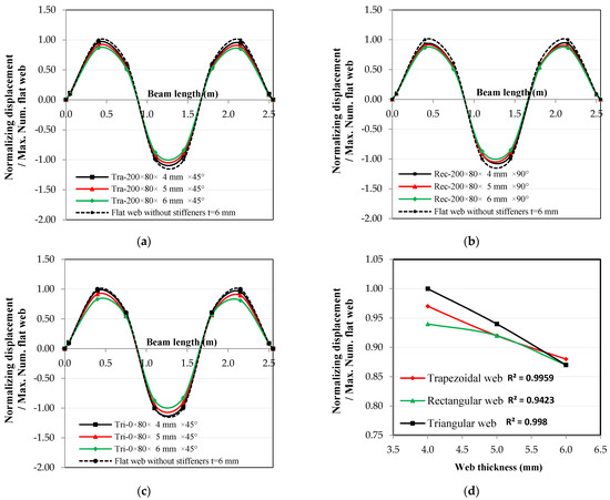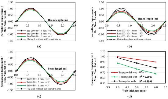 Thickness effect on the relationship between normalized displacement and beam length for the 2nd mode shape: (a) trapezoidal web, (b) rectangular web, (c) triangular web, and (d) thickness effect at the 2nd mode shape.