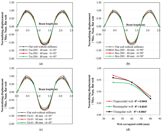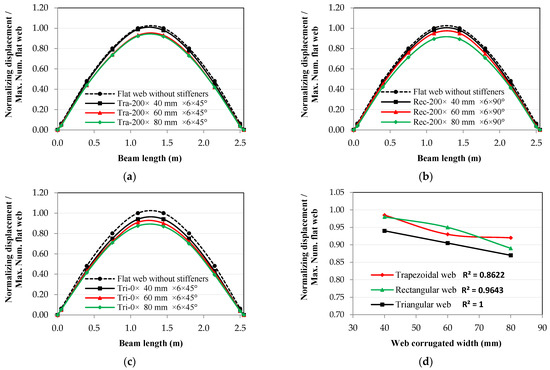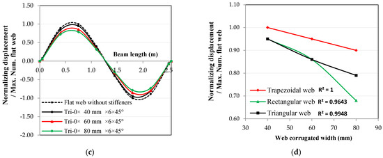Corrugated width effect on the relationship between normalized displacement and beam length for the 2nd mode shape: (a) trapezoidal web, (b) rectangular web, (c) triangular web, and (d) width effect at the 2nd mode shape.