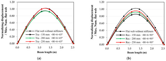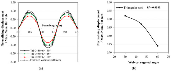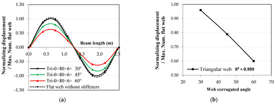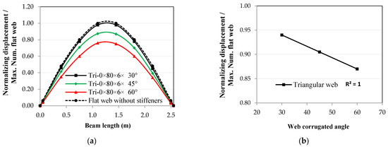 One of the most critical parameters in the corrugated web is the corrugation inclination angle, especially for triangular shapes. When the corrugated web angle increased, the displacements of the same mode shape decreased in the 1st, 2nd, and 3rd mode shapes, as shown in Figure 18, Figure 19 and Figure 20. The effect was linear only for the triangular corrugated web in the 1st and 2nd mode shapes, with a coefficient of correlation, r, equal to 1.00, but asymptotic to linear for the 3rd mode shape, with r = 0.97. From Figure 18b, Figure 19b and Figure 20b, for the triangular corrugated web, the ratio of decrease reached 0.87, 0.60, and 0.74 for the 1st, 2nd, and 3rd modes shapes, respectively, when the angle of the corrugated web was equal to 60°. Figure 18, Figure 19 and Figure 20 show that the section resistance to displacements in all mode shapes was enhanced for any value of the corrugation angle.