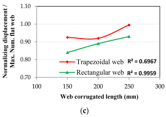 The effect of the length of the corrugated web is almost the same as the effect of the width. However, this effect is overturned when decreasing the length of the corrugated web and increasing the density or the stiffness of the steel beam. The decrease in length for all types of the corrugated web induced a decrease in displacements in the three mode shapes, as shown in Figure 15, Figure 16 and Figure 17. It was also noticed that the effect was linear only for the rectangular corrugated web in the 1st mode shape, as the value of the coefficient of correlation r = 1.00. For the 2nd and 3rd mode shapes, the effect was asymptotic to linear, with a value of the coefficient of correlation, r, equal to 0.97. In addition to that, the effect of the shape of the corrugated web affected the extent of decrease recorded for the same corrugated length. For the length of corrugated web equal to 150 mm, as reported in Figure 15c, Figure 16c and Figure 17c, it was found that the best type of corrugated web was the rectangular one, where the ratio of decrease reached 0.84, 0.59, and 0.85 for the 1st, 2nd, and 3rd mode shapes, respectively. The decrease recorded for the trapezoidal web was much more than the earlier type. In fact, the ratio of decrease was 0.92, 0.89, and 0.87 for the 1st, 2nd, and 3rd mode shapes, respectively. These findings agreed with the previous studies [1,2,6]. Figure 15, Figure 16 and Figure 17 show that for any value of the corrugation length, the section resistance to displacements in all types of mode shapes was improved.