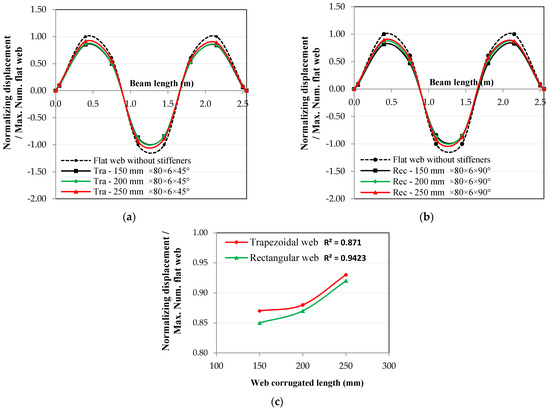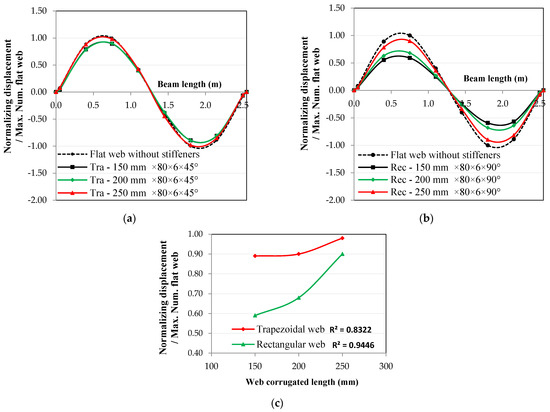 Corrugated length effect on the relationship between normalized displacement and beam length for the 2nd mode shape: (a) trapezoidal web, (b) rectangular web, and (c) length effect at the 2nd mode shape.