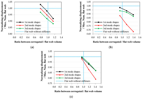 The relationship between normalized displacement and the ratio between corrugated to flat web volume for the 1st, 2nd, and 3rd mode shapes: (a) trapezoidal web, (b) rectangular web, and (c) triangular web.