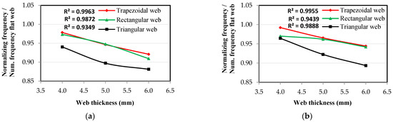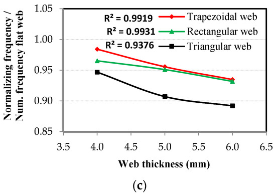 The relationship between normalized frequencies and corrugated web thickness: (a) frequency at the 1st mode shape, (b) frequency at the 2nd mode shape, and (c) frequency at the 3rd mode shape.
