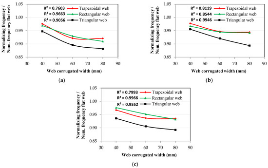 The relationship between normalized frequencies and corrugated web width: (a) frequency at the 1st mode shape, (b) frequency at the 2nd mode shape, and (c) frequency at the 3rd mode shape.