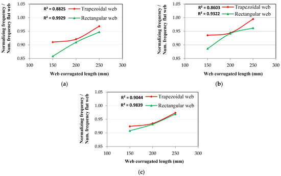The relationship between normalized frequencies and corrugated web length: (a) frequency at the 1st mode shape, (b) frequency at the 2nd mode shape, and (c) frequency at the 3rd mode shape.