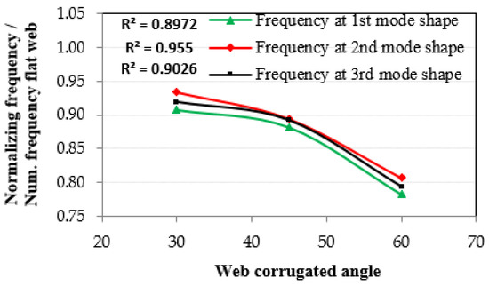 As the corrugated web angle increases, the natural frequencies of the same mode shape decrease in the 1st, 2nd, and 3rd mode shapes, as shown in Figure 25. From Figure 25, for the triangular corrugated web, the ratio of decrease reached 0.78, 0.81, and 0.79 for the 1st, 2nd, and 3rd mode shapes, respectively, when the angle of the corrugated web was equal to 60°. Figure 25 shows that the section resistance to natural frequencies was improved for any value of the corrugation angle.