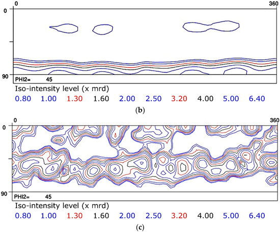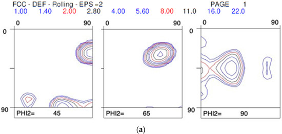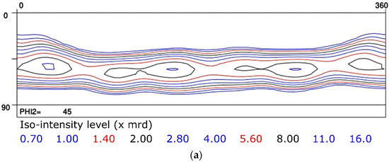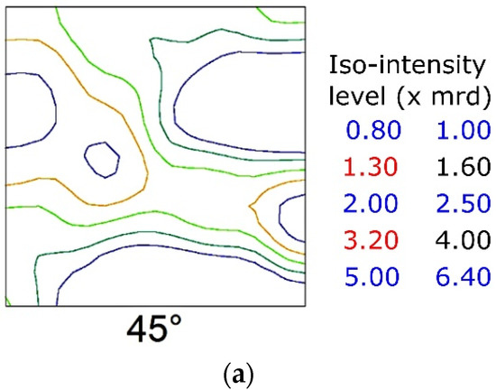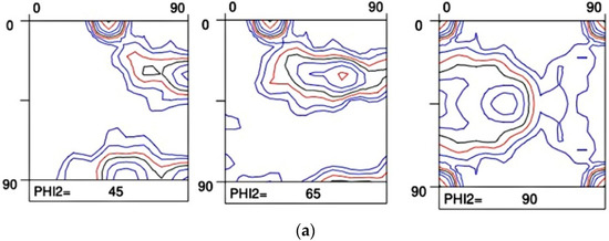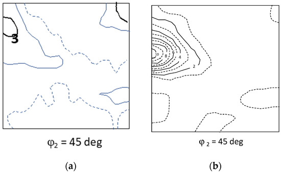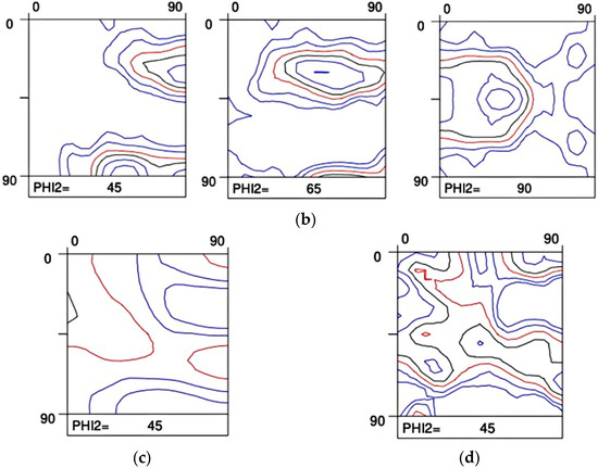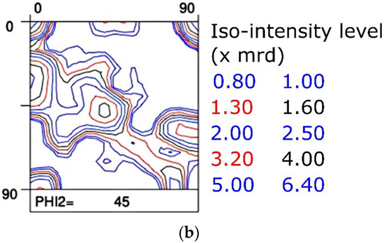 Yoshinaga et al. [15,16] published a very extensive study on the role of thermo-mechanical processing during hot rolling on texture development in Ti–IF steels with and without Mn addition. In Figure 2 the hot rolling textures from a Ti–IF steel (Figure 2a) and a Mn-added Ti–IF steel (Figure 2b) are compared. Figure 2a shows the typical transformation texture obtained after hot rolling in the austenite domain with the finishing pass below the Tnr temperature (Tnr = the temperature below which interpass recrystallization is no longer complete). This steel exhibits a weak maximum (3 mrd) in the vicinity of the {114}<110> component and the typical morphology of a transformed FCC β fiber texture, corresponding to the fact that the hot rolling was partially carried out below the Tnr temperature. The texture that was observed in the Mn-added IF steel, cf. Figure 2b, exhibits a strong maximum (10 mrd) in the {112}<110> component and virtually no intensity on the γ fiber (<111>//ND).