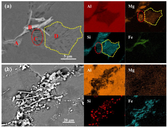 - Liu, Z.T.; Wang, C.; Luo, Q.; You, J.; Zhou, X.L.; Xu, J.; Mo, Y.T.; Song, J.W.; Zha, M.; Wang, H.Y. Effects of Mg contents on the microstructure evolution and Fe–bearing phase selection of Al–Mg–Si–Fe alloys under sub–rapid solidification. Materialia 2020, 13, 100850. [Google Scholar] [CrossRef]