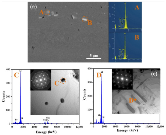 Si phase and rod-like β-Al5FeSi phase still exist in the T4P state strip, and their morphologies are respectively shown in circles A and B in Figure 2a. After cold rolling, the insoluble phases are further broken and their size decreases, reaching 2 μm. Furthermore, TEM was used to observe the precipitates in the grains, as shown in Figure 2b,c. The α-Al5(FeMn)Si (circle C) exists generally in the matrix, but the quantity is small. The presence of β’ phase (point D) was found in only a few regions. Both precipitates were formed during homogenization [20]. Because the aging time was too short, no β” precipitates were observed in all the TRC strips with different Si contents. These results are consistent with those obtained for the strips prepared from DC ingots [21].