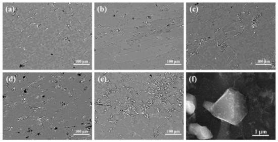Distribution of Si particles in near-surface regions of homogenized TRC strips with different contents of Si: (a) 0.7 wt%; (b) 0.9 wt%; (c) 1.1 wt%; (d) 1.3 wt%; (e) 1.5 wt%; and (f) Si particle morphology.