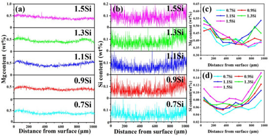 A solute gradient is always observed in the vertical twin-roll casting (VTRC) strip. While the degree of microsegregation can be weakened during the subsequent heat treatment, the solute gradient at the macroscopic scale cannot be completely eliminated, significantly affecting the mechanical properties of the strip. EPMA was used to carry out line scanning on the longitudinal section of the strips along the thickness direction (for each strip, the thickness was 1 mm). The concentration gradients of Mg and Si are shown in Figure 4a and Figure 4b respectively. To compare the solute gradients of the different strips, the average value of every 100 data points was calculated, and the average values are connected by straight lines. The results of Mg and Si are shown in Figure 4c and Figure 4d respectively. The Mg and Si elements in all of the samples showed a negative solute gradient from the surface to the core regions of the strips. Grydin and Liu et al. found a similar phenomenon in VTRC strips, but did not carry out an in-depth analysis of its formation mechanism [23,24]. The negative solute gradient was generated in the strip during the TRC process, and its formation mechanism is analyzed in detail in Section 4.1. In addition, an element-positive segregation region with two surrounding elemental barren regions (EBRs) was found at the core regions of the strip. The amount of the elements added to the Al-Mg-Si alloy is generally low. EBRs have a greater impact on the mechanical properties because the alloying composition of the region is closer to that of pure aluminum, and the strain-hardening capacity is significantly reduced. The five groups of samples had similar contents of soluble Mg in the EBRs. The amount of soluble Si in the Al matrix increases with the thickness in any region when increasing the amount of added Si. When the Si content increased from 0.7 wt% to 1.1 wt%, the elemental content in the EBRs increased significantly.