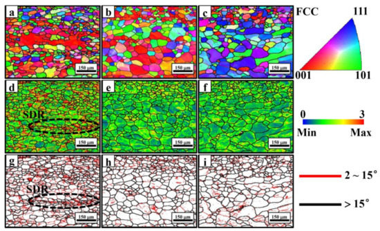 The initial deformation of the samples was analyzed by the KAM and GB distributions, as shown in Figure 5d–i. A larger local misorientation angle in the KAM map indicates larger deformation [25]. An obvious non-uniform deformation was found in the sample with 0.7 wt% Si. Local strong deformation is mainly distributed at the grain boundaries and even through the grains. A band of a strong deformation region (SDR) passed through multiple grains approximately 350 μm from the surface of the strip. When the deformation increased further, a crack generation region appeared. The starting point (the x-coordinate is 0) of the line scanning of the sample with 0.7 wt% Si in Figure 4 is the same position as the upper edge of Figure 5d. It can be seen from the two figures that the EBRs and the strong deformation band of the sample with 0.7 wt% Si are both approximately 350 μm away from the surface. It can be inferred that the strong deformation band is generated in the EBRs. The GB distribution map shows that low-angle GBs at a high density are generated in the strong deformation area. They were transformed from a large number of accumulated dislocations, providing favorable conditions for the formation of microcracks. By contrast, only a small number of low-angle GBs were found in the samples with 1.1 wt% and 1.5 wt% Si, indicating that the deformation was more evenly distributed in each grain.