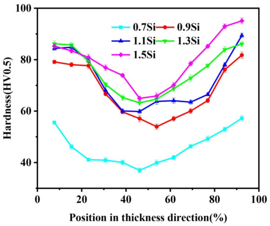 Figure 6 shows the hardness distribution of the longitudinal section of the strip in the T4P state along the thickness direction. The TRC strip has the characteristics of a hard shell and a soft core [26], and the strip in the T4P state still has this characteristic. With an increase in the Si content, hardness increased at all positions along the thickness direction, with the largest increase observed when the mass fraction of Si was increased from 0.7% to 0.9%. However, when the mass fraction of Si exceeded 1.1%, the effect of the hardness improvement was significantly reduced. This is because the excess Si is more commonly found in the form of insoluble Si particles in the alloy, and the increase in the Si content in the Al solid solution is limited.