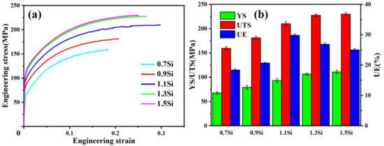 Tensile properties of the strips with different Si contents. (a) Engineering stress–strain curves. (b) Strength and uniform elongation.