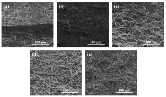 Tensile fracture morphologies of the strips with different Si contents: (a) 0.7 wt% Si; (b) 0.9 wt% Si; (c) 1.1 wt% Si; (d) 1.3 wt% Si; (e) 1.5 wt% Si.