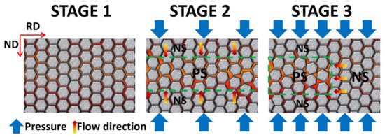 In addition, the lowest solute concentration in the strip was not found in the centerline region. As can be seen from the element distribution results in Figure 4, an area with a high content of solute elements often appears on either side of the centerline of the strip, which is actually a small-scale solute aggregation. The segregation is different from the macroscopic segregation mentioned above, which is formed by the flow of melt between the grains late in the solidification process. The formation process is divided into three stages, as shown in Figure 10. The gray, orange, blue, and orange arrows in the figure represent the solidified grains, melt, pressure direction, and melt flow direction, respectively. In stage 1, the melt containing a large number of solidified grains was concentrated in the middle region and behaved as a non-Newtonian fluid under stress. During deformation, the intercrystalline gap increases due to the sliding of the grains, leading to Reynolds dilatancy, as shown in stage 2. To compensate for the negative pressure formed by the new gap, the surrounding fluid is sucked into the middle region, where the solute concentration increases to generate positive segregation (PS), whereas the solute concentration in the surrounding regions decreases to generate negative segregation (NS), as shown in Figure 4. The regions with NS were the EBRs mentioned above. With the increased deformation in stage 3, some grains completely fit together, the gaps of other grains continued to increase, and the surrounding liquid was completely absorbed, finally forming the PS and NS regions that appeared as an intermittent linear segregation band on the macro. Since the segregation region is discontinuous in the RD, line scanning by EPMA along the ND may not cover the PS region. For example, the Mg element of the sample with 1.1 wt% Si in Figure 4 does not show the peak value of Mg in the middle region.