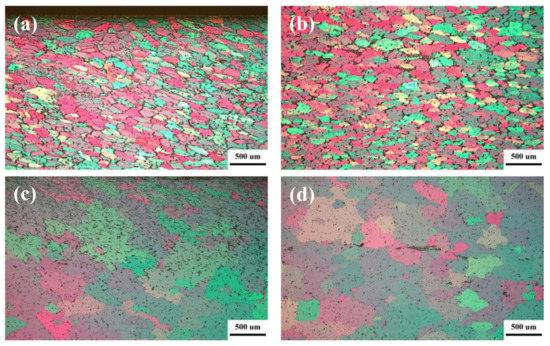 Grain morphology in the surface (a) and centerline (b) of TRC strips and in the surface (c) and centerline (d) of homogenized TRC strips with the content of 1.1 wt% Si.